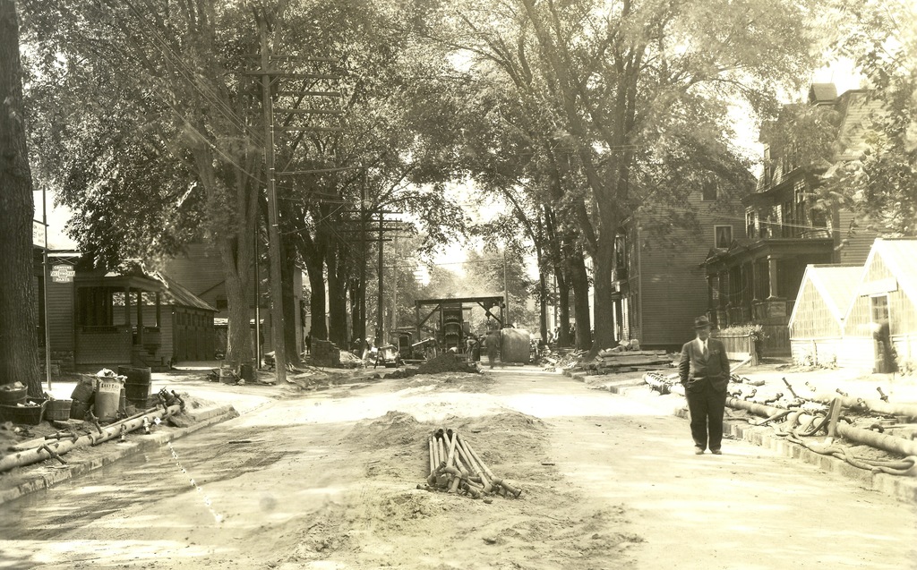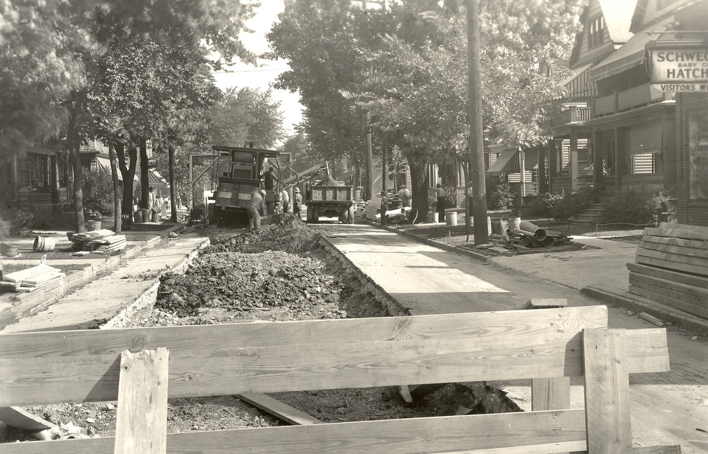 Another look at the work done along Bailey Avenue, this time looking south from Littel Street, on the same date as the previous image. Perhaps the free entertainment provided by the work made up for the inconvenience for the two people sitting on the porch at upper left.