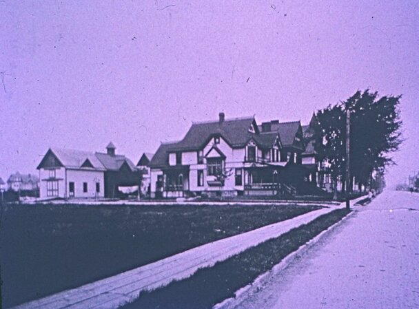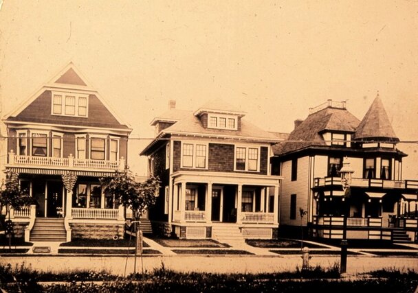 An early 20th century view of three of the original houses on West Hazeltine Avenue, numbers 40, 46 and 54. All three stand today, though altered in appearance. The conical roof tower on number 54 remains, but the ornamentation has largely been removed or covered. Note that the street already has curbs, sidewalks, gas street lamps and fire hydrants. Amenities such as these were made easier by the incorporation of the village in 1899.