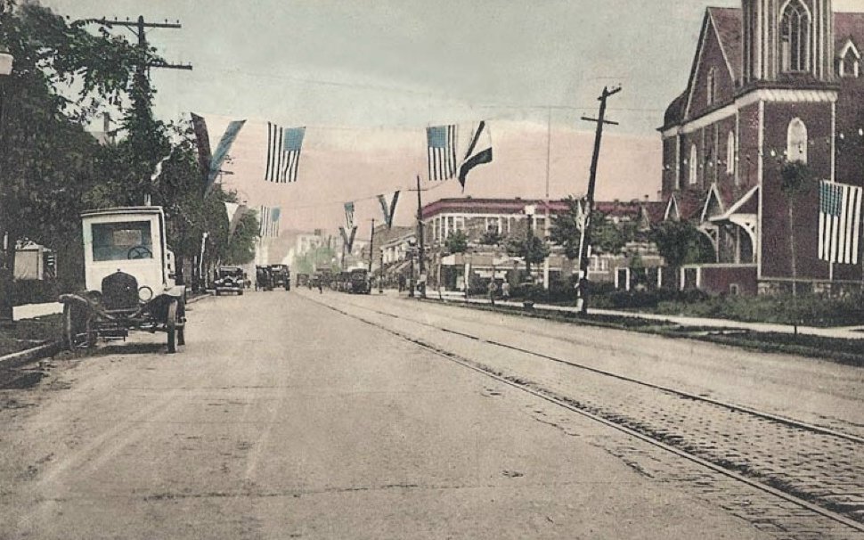 Delaware Avenue, looking south, about 1926. Prominent is the streetcar track, the extension of which prompted LPA Eberhardt to develop residential lots north of the City of Buffalo. In this image, St. Paul’s R.C. Church is on the right, and a new business block has opened between Victoria Avenue and Lincoln Blvd. The village is decorated for an Independence Day parade.