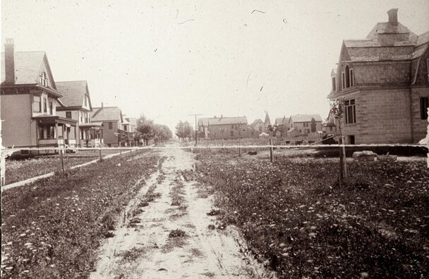 West Tremaine Avenue (Parkwood) before any grading was done to the street. A wooden sidewalk is in place on the north side and various houses in the $3,000-4,000 range are under construction. The Methodist-Episcopal Church steeple on Delaware Avenue can be seen in the distance.