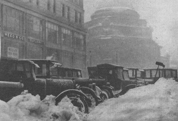 A snowy look up Genesee Street, near the intersection of Main Street, ca. 1924. Note the dome of the Buffalo Savings Bank looming in the wintry gloom.