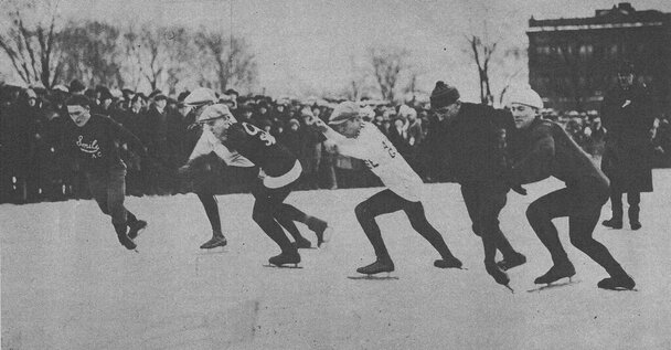 Speed racers get set to compete in the 100-yard skating dash at the annual skating carnival at Humboldt Park. These carnivals were held at Delaware, Humboldt and Cazenovia Parks, under the direction of the City Bureau of Recreation.