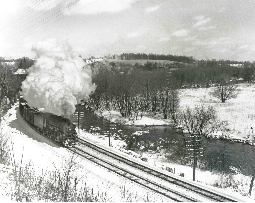 Clear tracks and winter sunshine present no problems for this freight train on the Erie Railroad in 1947.