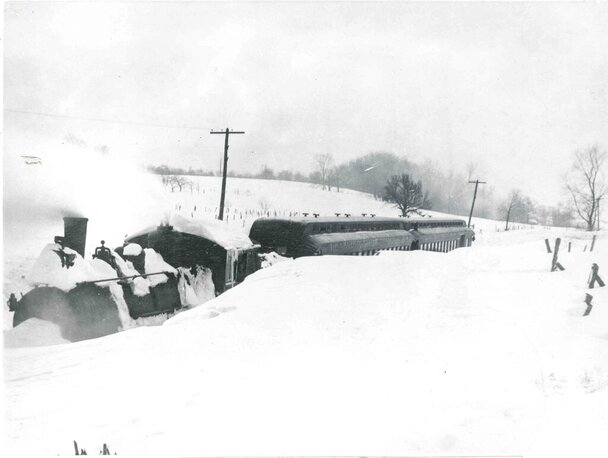 Sometimes the rails were not so clear! This locomotive is engulfed by snow in the Wooglin Cut, south of Hartfield, NY, on the Jamestown Chautauqua & Lake Erie RR, 1912.