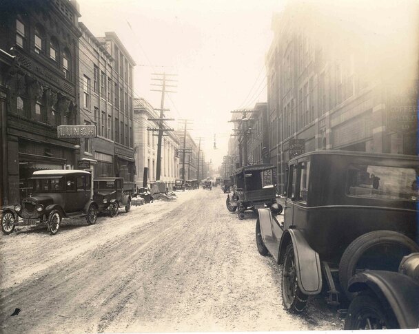 West Second Street, Jamestown, in the early 1920s. Note the chains visible on the car tires to the right.