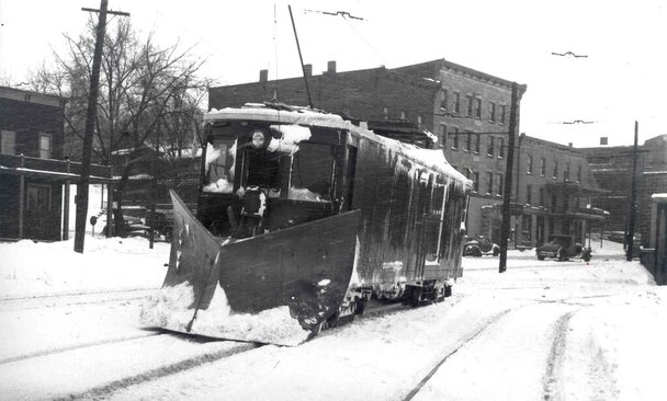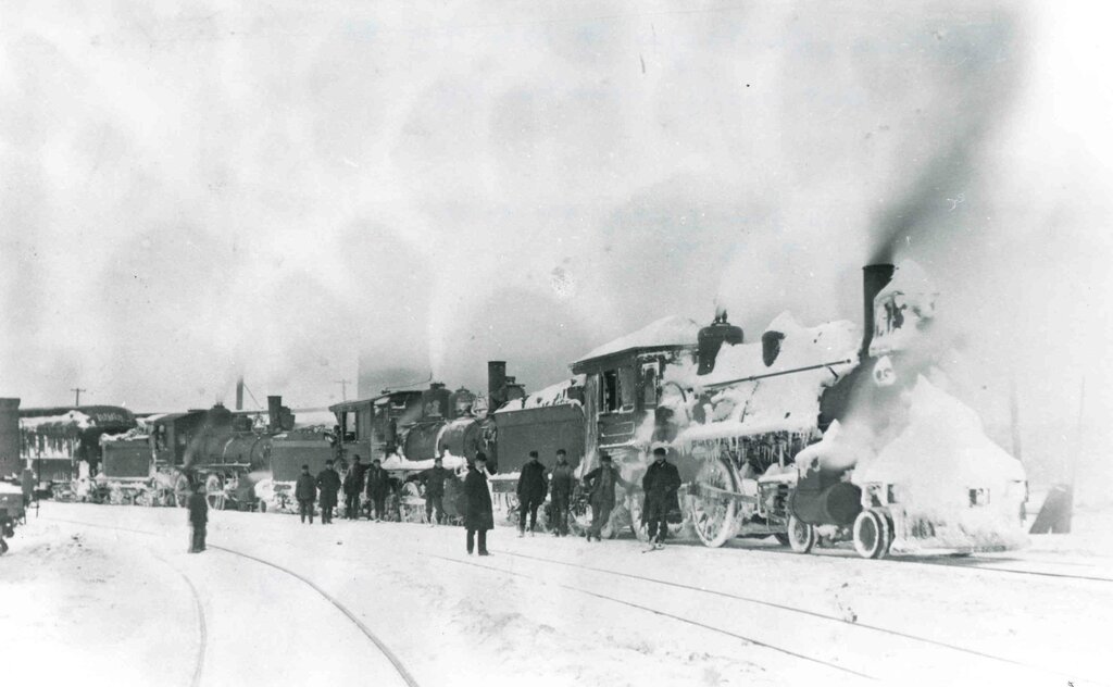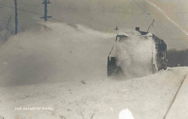 A postcard showing the rotary snowplow at work in Jamestown. The rotary was a large circular set of blades affixed to the front of a train car to cut through snow on the track ahead.