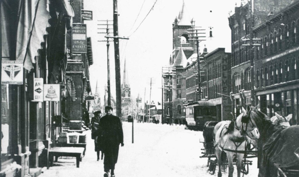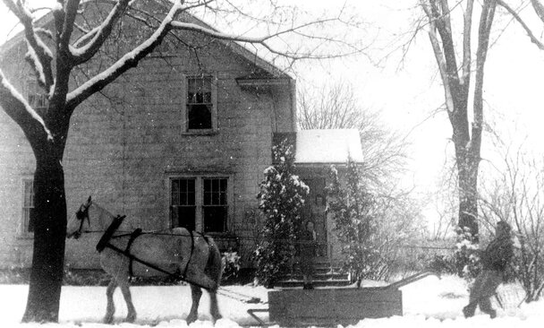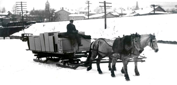 A horse-drawn sleigh on Chandler Street, Jamestown, near the Erie Railroad Freight Station, ca. 1935.