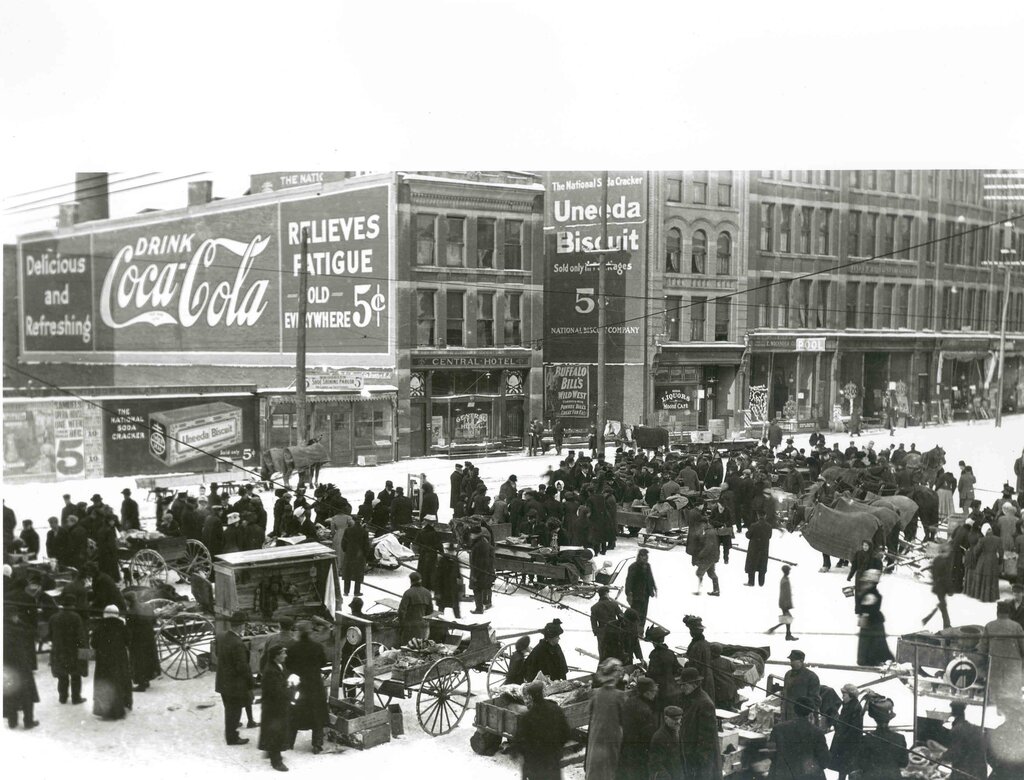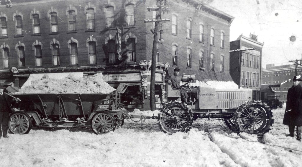 Snow removal efforts in Brooklyn Square, Jamestown, at the corner of Taylor and South Main streets, ca. 1920.