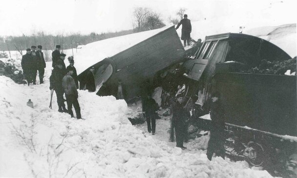 A Jamestown, Chautauqua and Erie Railroad plow has come off the track on Westfield Hill north of Mayville, ca. 1935.