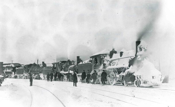 The Jamestown, Chautauqua and Erie Railroad at Boat Landing in Jamestown. Engines #4, #9 and #5 have just returned from fighting the snow, ca. 1912.