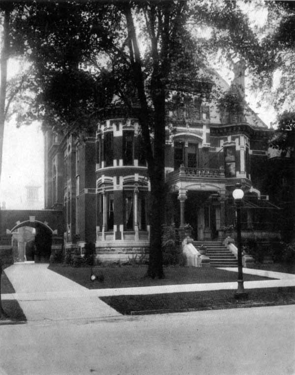 "Through great panes of beveled plate glass set in the ample front doors, one can look into the entrance hall. The interior woodwork is of mahogany, cherry, and ebony. In the mahogany-paneled drawing room, to the right of the entrance hall, is a great fireplace surmounted by a carved mantel. From the mantel, a beautiful mirror rises to the ceiling. The woodwork of the library is ebony. Its ceiling is ornamented with an oval hand-painted design of angels done in gold. The walls are covered with tapestries and rich brocades that endure, virtually unchanged, for decades. First floor rooms included a solarium, dining room, breakfast room, kitchen, and Dr. Howe's offices and laboratories, and waiting rooms. The upper stories were divided into sleeping rooms, living rooms, and servants' quarters."
