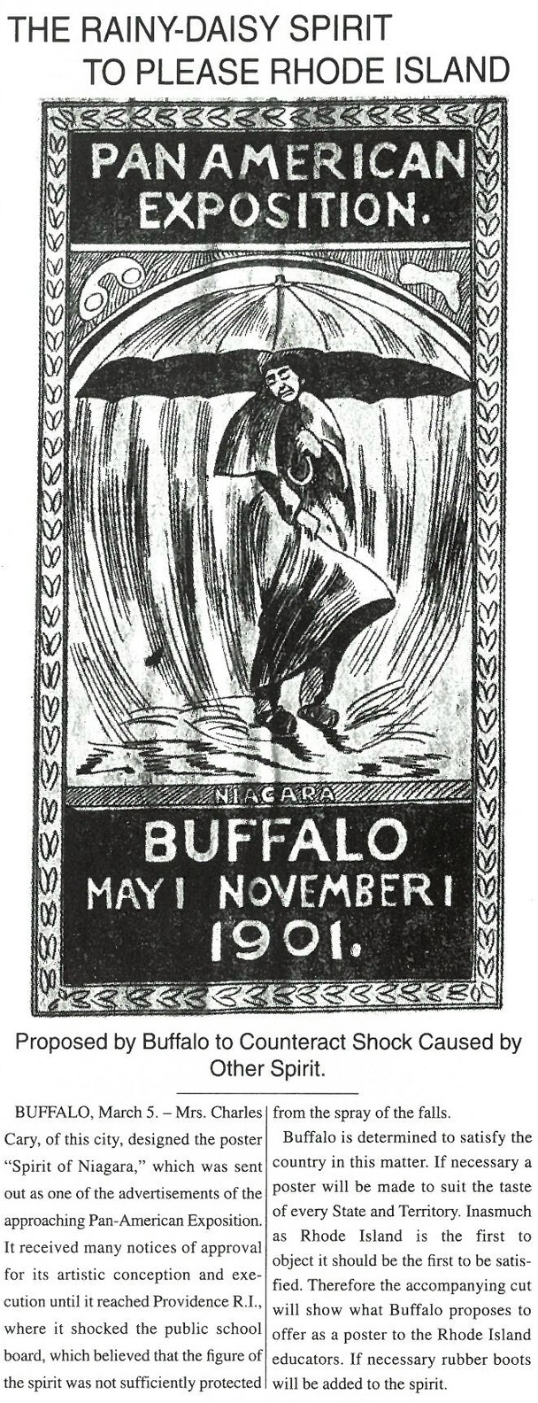 On February 2nd, a Journal reporter placed tongue firmly in cheek and stated that “the trouble seemed to be the neglect, the malicious neglect, of Mrs. Cary to cover Miss Niagara with three buckle overshoes and an automobile coat.” In addition, the Boston Post, picked up the gauntlet, claiming that Boston’s famous guardians of morals “have not yet found occasion to blush.” As soon as the Buffalo papers reprinted the articles, Pan-Am artist, Chris Muegel, took up the challenge and created Rainy Daisy. The replacement image of a crone in umbrella and auto coat delighted the press. The New York World, in particular, was overjoyed that now the “Spirit of Niagara” was sufficiently protected from the spray of the Falls.”