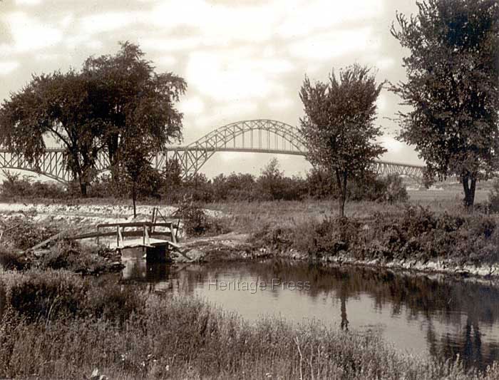 South Grand Island Bridge in background, remains of the Erie Canal in foreground. Late 1930s.