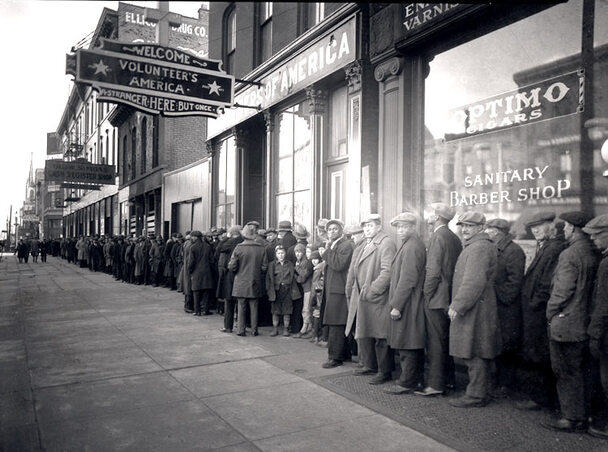 Thanksgiving Day, 1931. Buffalo citizens -- black and white, adult and children -- line up for food on both sides of the entrance to the Volunteers of America at 77 Broadway. That organization, still in existence in 2003 (their web), says, "The Great Depression of the 1930s stretched the nation's private social welfare system almost to the breaking point. Volunteers of America mobilized to assist the millions of people who were unemployed, hungry and homeless. Relief efforts included employment bureaus, wood yards, soup kitchens, and "Penny Pantries" where every food item cost one cent."