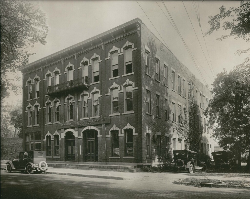 The Robert H. Newell & Company, Inc., ca. 1924, manufactured custom-tailored shirts for 86 years. What appears to be an early-1920s Cole Aero-Eight Sport Sedan in the lower left, identified by its unique octagonal rear and rear quarter windows, helped date the photo.