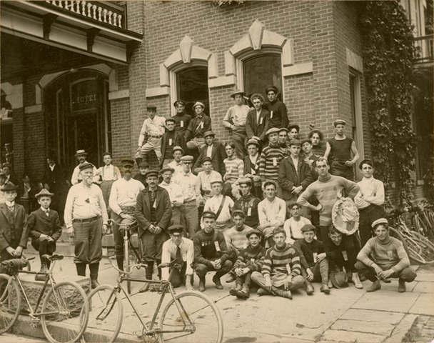 This photo, taken in 1901 during the building’s hotel days, shows a band of bicyclists who traveled to Medina and posed for a photo op. The current incarnation of the hotel gets lots of bicycle visitors every day who are passing through on the Erie Canal towpath, a stone’s throw from the building.