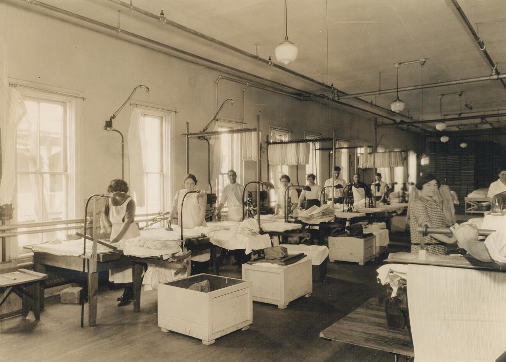 The R.H. Newell & Son shirt factory employed numerous local people for 86 years, including those seen here, until they closed their doors in 2004. This photo was taken in 1924 for company marketing purposes. It shows a sewing room located on the first floor of the factory in what is today the “Shirt Factory,” a café and cocktail bar.