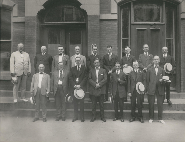 Taken on the front steps of the building, this photo shows Newell Shirt Factory salesmen attending a convention held in Medina in 1924. Robert H. Newell would summon the salesmen to Medina periodically to review new product lines.