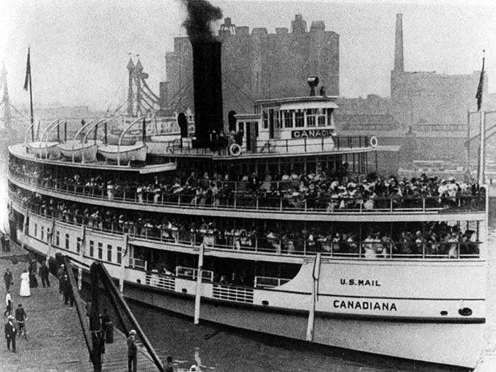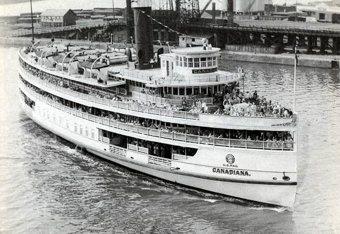 The boat could carry 3,500 passengers, but after the Peace Bridge opened in 1929, the days of both the Canadiana and the Americana were numbered. The Americana was sold in 1929. The Canadiana soldiered on, with ticket prices kept low in order to attract the 2,000 passengers per trip needed to meet expenses. But the 1956 season was the last and the boat was sold, briefly seeing service in Ohio. It was sold a number of times after that until it ended up resting on the bottom of the Cuyahoga River in Ohio.