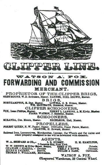 BUFFALO CLIPPER BRIG: 1850s advertisement for the Watson Fox firm located in the picturesque wharf's "chequered warehouse."