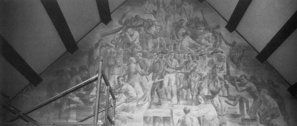 This building contains four murals that were examined in August by a noted art historian. She recommended that they be included in educational programs and preserved on the site. Three of the murals were painted between 1938 and 1940, most likely under the Works Progress Administration.