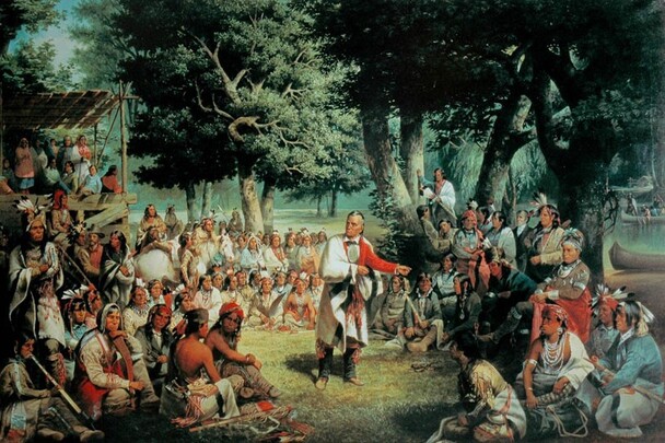 "Trial of Red Jacket" painting by John Mix Stanley. Centerspread reproduction in the Summer 2004 Heritage Magazine. Image source: Buffalo & Erie County Historical Society.