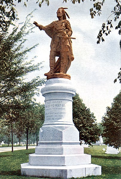 The statue of Red Jacket was erected atop the granite base in 1891, after funds were raised. The bronze statue shows Red Jacket dressed in his embroidered red jacket, wearing the silver peace medal given to him by George Washington, poised as if to continue an oration.