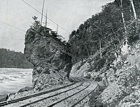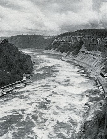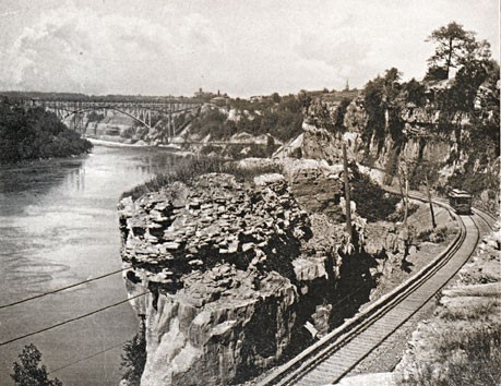 Commencing at the Falls the most wonderful of river canyons, the Niagara Gorge is entered by a gentle grade on the side of the rocky gorge. Passing under the Cantilever Bridge and the New Steel Arch which span the river, the line reaches the lower level at the Whirlpool Rapids. The waters which have been slowly moving in solemn smoothness as though resting after their terrific leap, here rise like maddened horses and with irresistible forces are suddenly lashed into fury indescribable. It was in these rapids that the brave English swimmer, Captain Matthew Webb, on July 24, 1883, in a brave but foolhardy attempt to swim them, lost his life. Here is also the first Maid of the Mist was at times almost entirely submerged in making her memorable and thrilling run to Lake Ontario.