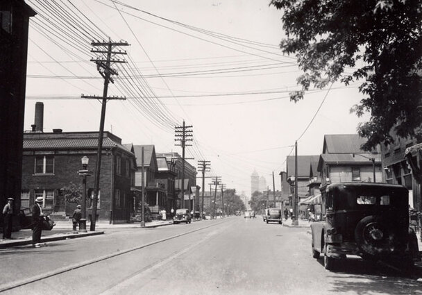 Looking along Clinton Street toward downtown; Walnut Street intersection just ahead. June 27, 1937. In the distance is the Liberty Bank building and behind it Buffalo City Hall.