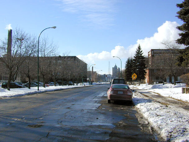The same view in 2003. Walnut Street no longer extends south to Clinton; it terminates at William Street. On the north side (right in photo) are the Towne Gardens Apartments. On the south side is the Buffalo Academy for the Arts (visible at left), the JFK Community Center, and the JFK Recreation Center.