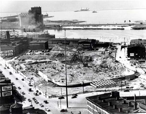 Foundations of Memorial Auditorium being poured, 1939, Main and the Terrace. Foot of Main Street at right, leading to the Canadiana dock.