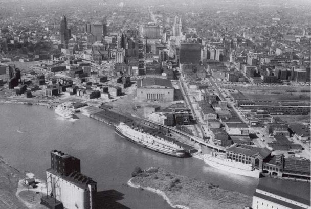 The foot of Main Street, 1946. The passenger ship Greater Detroit is docked (center) at the Central Wharf; the ship South American is docked at the D. L. & W. terminal at right. The Canadiana is visible near its berth at the terminus of the Commerical slip, upper left.