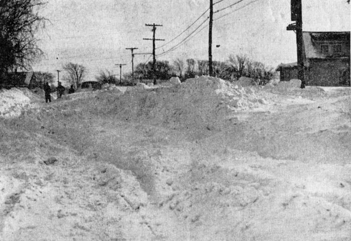 "Almost impassable to traffic is Abbott Rd. outside the city line. Here is how it looks near the Ridge Rd. intersection, where seven-foot snowdrifts have plugged it. In the background is a stalled car, one of many such storm victims."