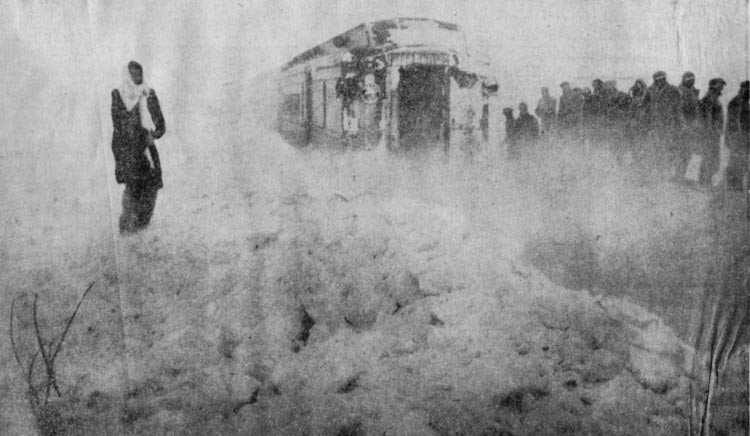 "Passengers taken off stalled train in Orchard Park. Wind swirled snow about this Baltimore & Ohio train, stalled since Wednesday morning while workers and passengers stood by when this dramatic picture was made by William Fredricksen of California Rd., who, with other village residents, took the 100 Buffalo-bound passengers coffee and sandwiches. Early today, the train's fuel for heating gone, the passengers were removed to Orchard Park homes."